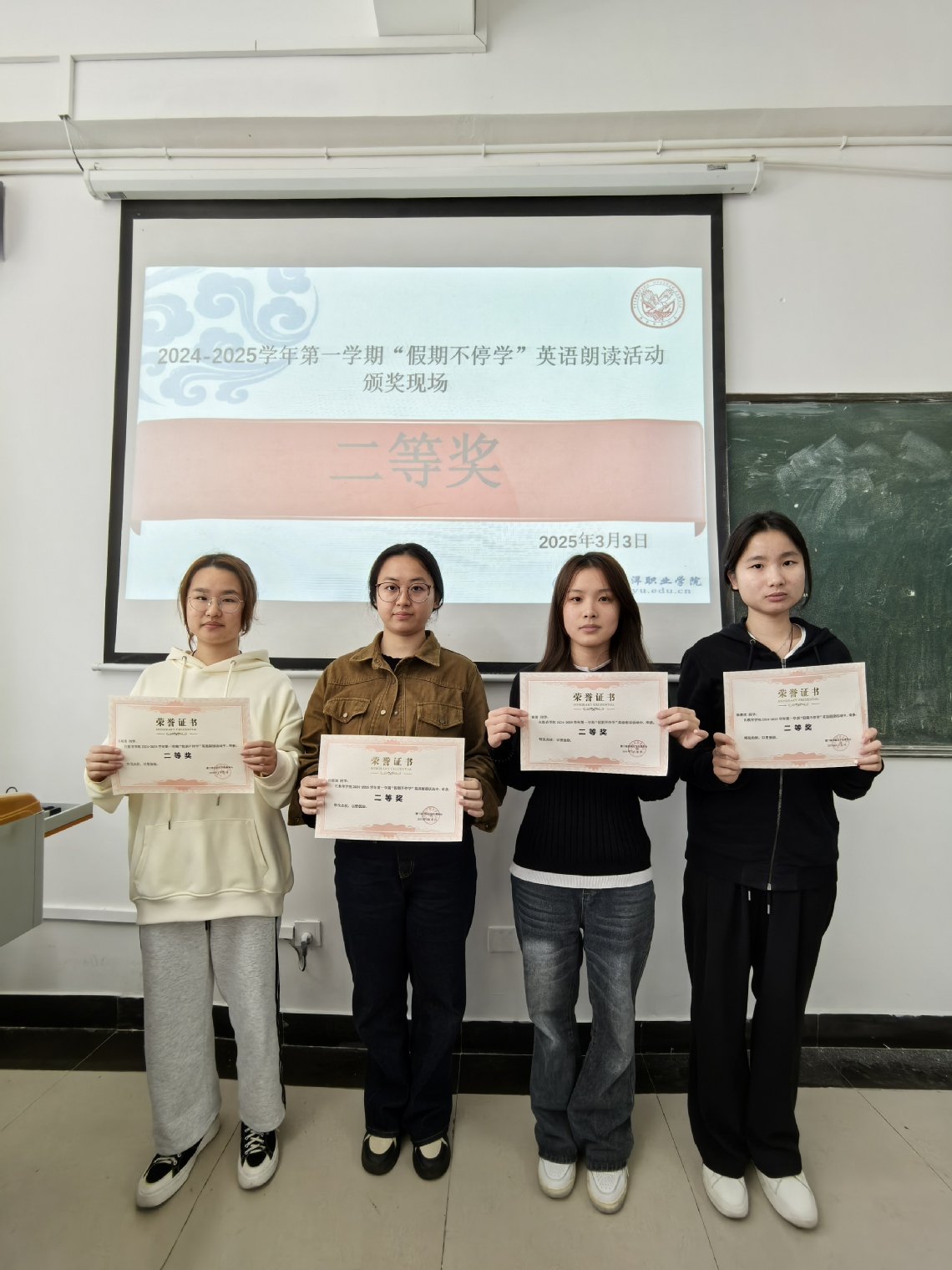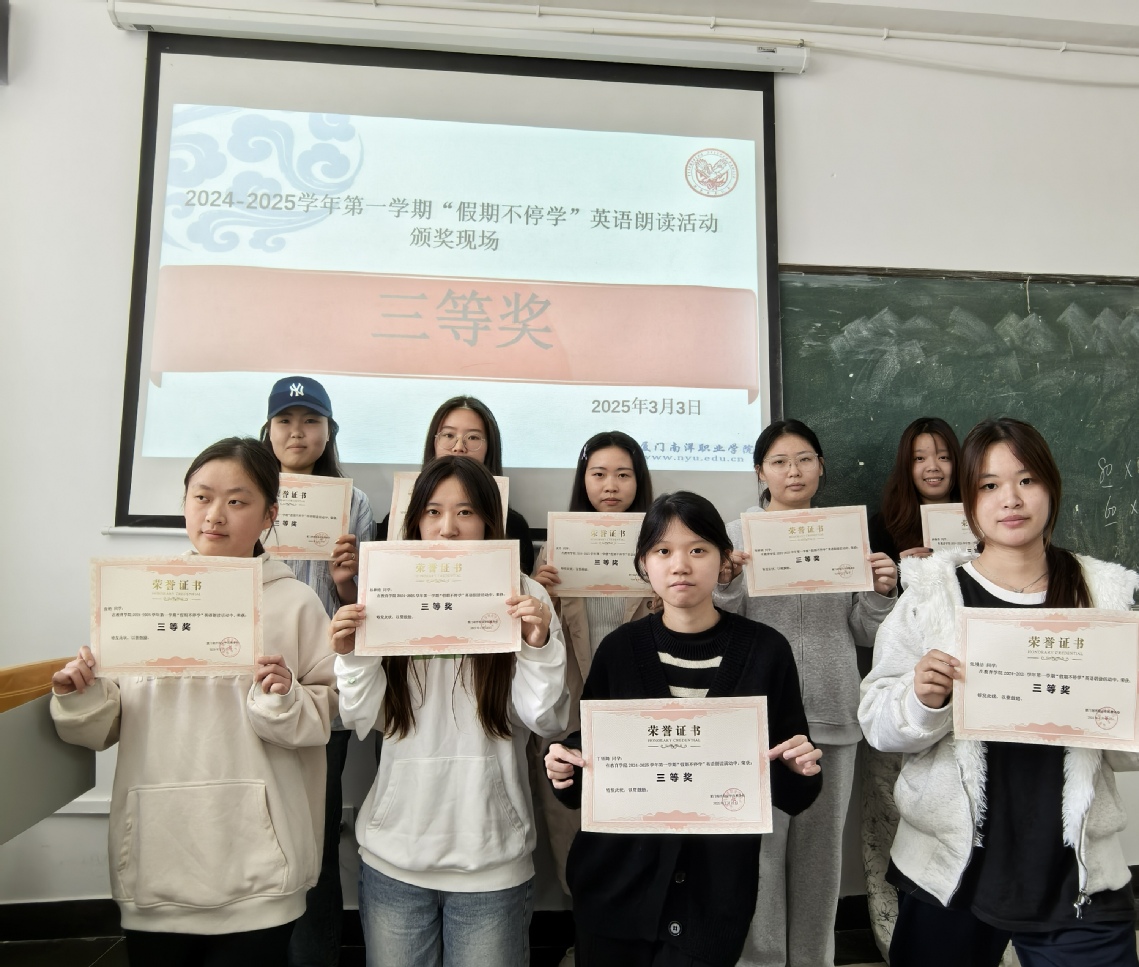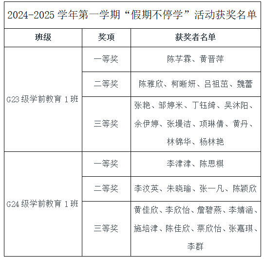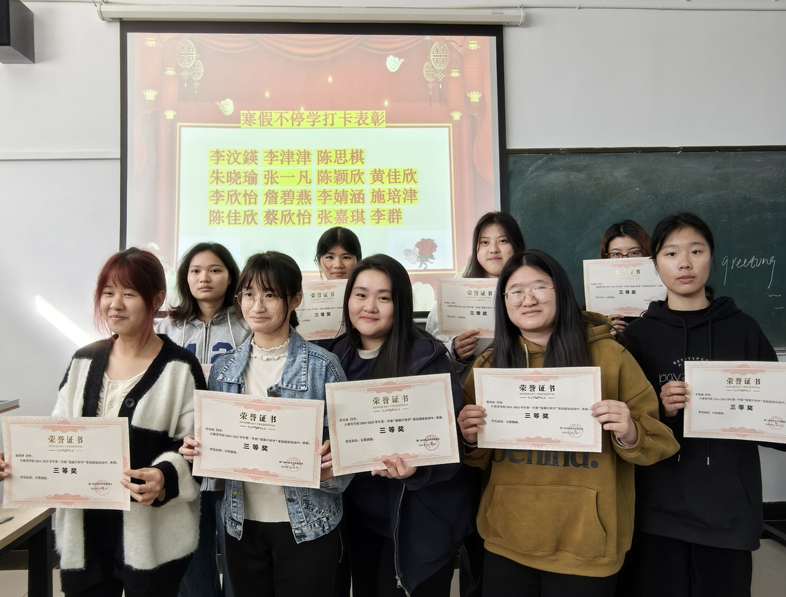 近日,教育学院在教学楼C103和C105教室举办2024—2025学年第一学期寒假“假期不停学”英语朗读活动颁奖典礼, G2023级、G2024级学前教育英语特色班共31名学生获奖,其中各班最终评选出一等奖2名、二等奖4名、三等奖9名。