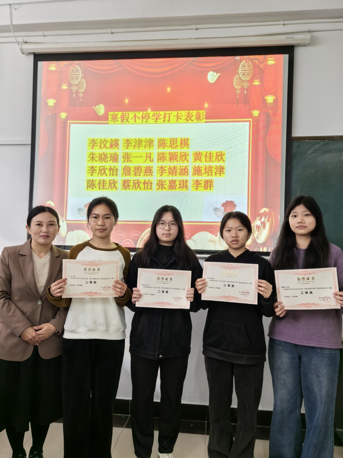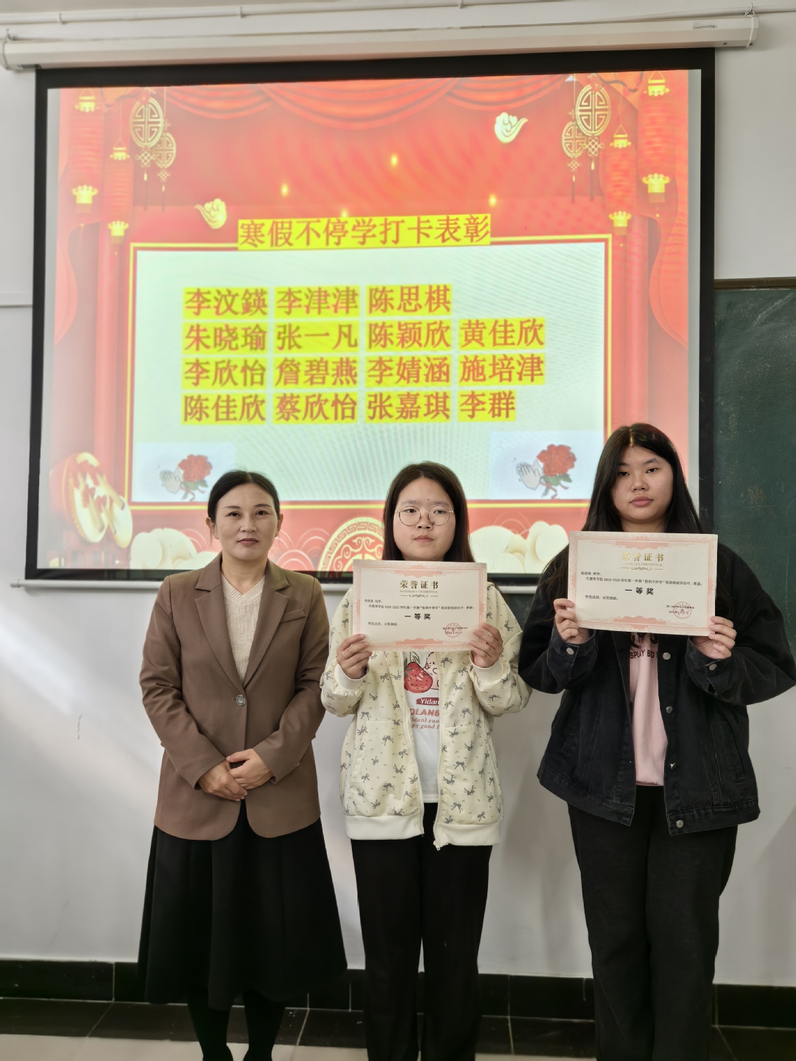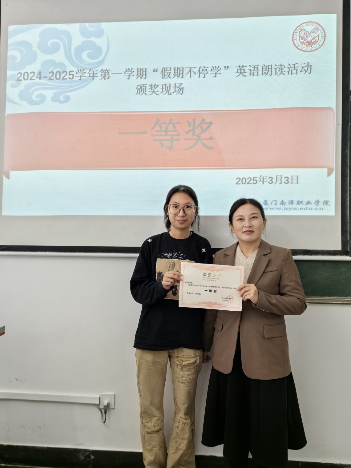 近日,教育学院在教学楼C103和C105教室举办2024—2025学年第一学期寒假“假期不停学”英语朗读活动颁奖典礼, G2023级、G2024级学前教育英语特色班共31名学生获奖,其中各班最终评选出一等奖2名、二等奖4名、三等奖9名。
